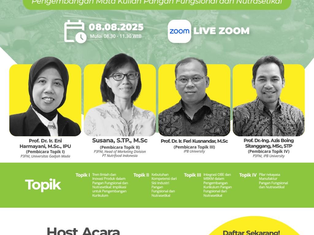 🌟 WORKSHOP ONLINE P3FNI 2025 🌟📌 Pengembangan Mata Kuliah Pangan Fungsional dan Nutrasetikal🗓 08 Agustus 2025 | 🕗 08.30 –…